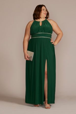 This stunning halter gown is perfect for any special occasion. The soft jersey knit fabric drapes beautifully, creating a flattering silhouette. The rhinestone waist adds a touch of sparkle and glamour, making this gown truly stand out. Whether you're attending a wedding, prom, or any other formal event, this gown is sure to make you feel like a princess. Pair it with your favorite heels and accessories for a complete look that will turn heads all night long. Make a statement in this elegant and sophisticated gown from David's Bridal.