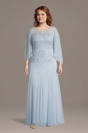 A sleek sheath dress for mothers of the bride and groom featuring an illusion beaded bodice and softly draped sleeves. Designed to shimmer with every move, it delivers an elegant look made for the spotlight.