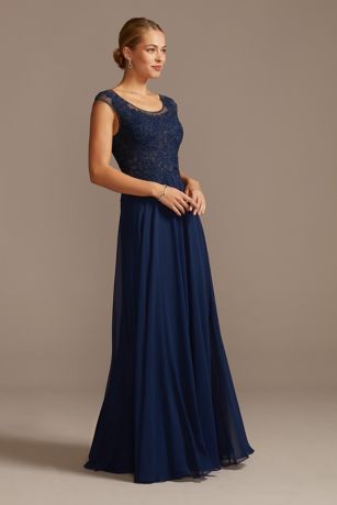 Corded lace swirls cover the illusion bodice of this elegant chiffon dress. Tonal crystal embellishment adds extra depth and drama to the elegant evening look.