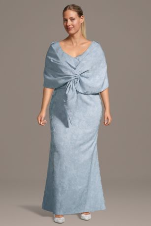 This jacquard sheath dress pairs effortlessly with a coordinating wrap jacket, creating a polished and elegant look perfect for mothers of the bride or groom.