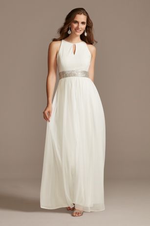 The keyhole jersey bodice and flowy mesh skirt of this beautiful gown are paired with a dramatic waist embellishment, featuring rows of sparkling crystals and beads.