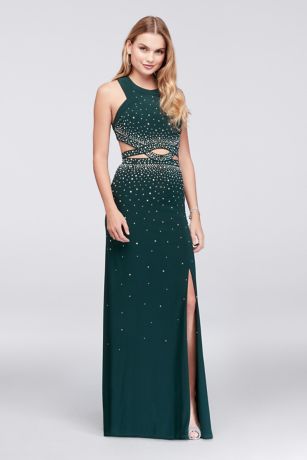 Iridescent crystals are scattered across bodice and skirt of this cutout jersey halter gown, creating a star-like, twinkling effect. Finished with an open back and a small train.