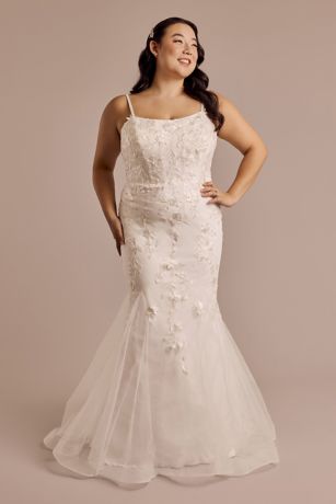 A flirty mermaid silhouette is always trending. With skirt godets and intricate lace appliques, this spaghetti strap wedding dress can't wait to be shown off on your big day.