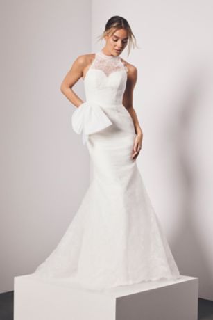 Intricate guipure lace sculpts the silhouette of this Vera Wang Bride mermaid gown, creating rich texture and refined, body‑skimming structure. An illusion high neckline offers a modern, high fashion touch, while the dramatic removable bow sash adds couture charm. A classic button back completes the look.