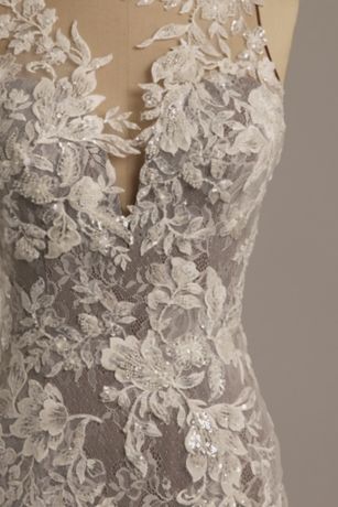 Three types of lace come together on this extraordinary mermaid wedding dress. The appliques climb up the plunging illusion neckline and down the back, where crystal buttons add the finishing touch.