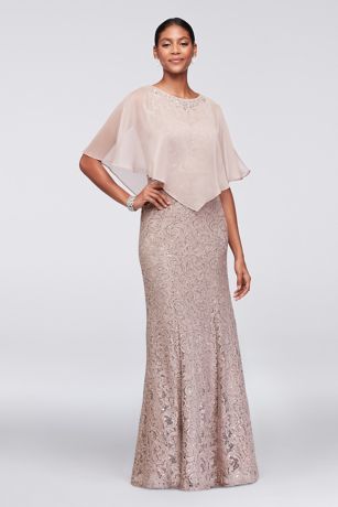 Topped with a crystal-embellished sheer chiffon capelet, this sequined lace mermaid dress has just a hint of flare at the hemline for easy movement.