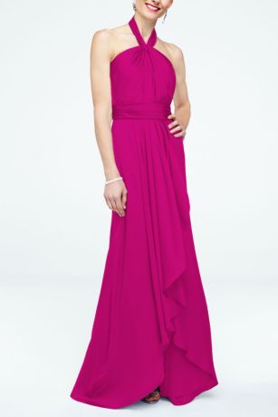 - Sleeveless matte charmeuse bodice with y-halter neckline and figure flattering ruched waistband.