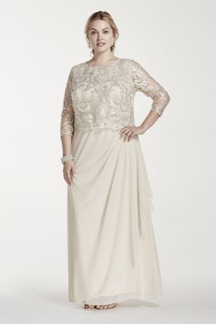 You'll be the definition of elegance in this sensational lace pop-over mesh dress! This long and luxe mesh dress features a 3/4 sleeve illusion sequin pop-over, and floral lace overlay for a touch of glamour. Skirt features a side ruffle for added drama and movement and a side slit.