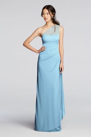 This long mesh bridesmaid dress is the definition of graceful, with an illusion one-shoulder and side cascade that falls beautifully down the length of the dress.