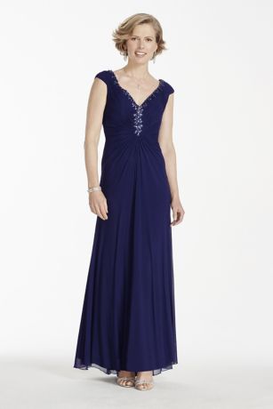 - Long power mesh dress with cap sleeve bodice features a double V-neckline and back detail that is adorned with dazzling beads.