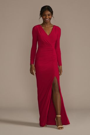 A long-sleeve bridesmaid dress that's easy to wear and easy to love, this flattering style is made of stretch jersey fabric, with a surplice bodice, ruching, and a side slit.