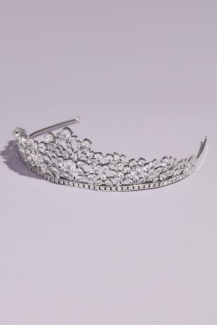 A large solitaire-cut crystal, framed with marquise and solitaire stones, shines brightly at the center of this dramatic tiara. Delicate trim of solitaire-cut stones sits at the bottom for an extra element of sparkle.