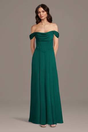 This matte satin dress features an elegant off-the-shoulder neckline and a flattering corset bodice with a basque waist. The glamorous silhouette is perfect for bridesmaids and special events.