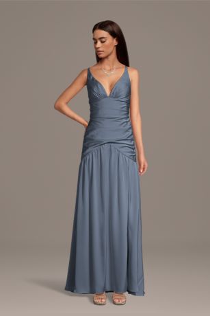 Crafted from smooth matte satin, this dress gets its glamour from tank straps and a beautifully draped drop-waist bodice. The skirt swishes gracefully, making it perfect for bridesmaids or a big night out.