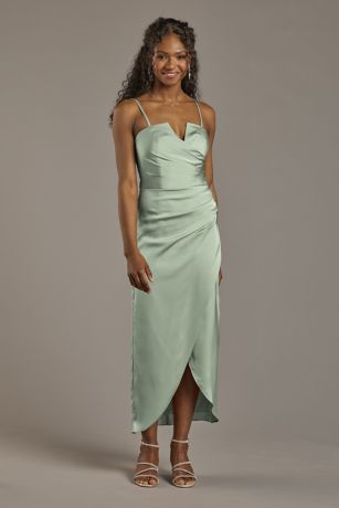 With a side-draped bodice and V-notch neckline, this matte satin midi dress is a chic choice for bridesmaids and partygoers.