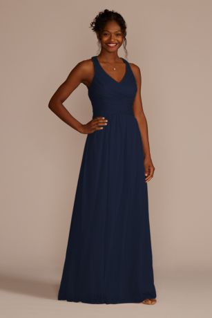 This stunning long bridesmaid dress features elegant crisscross back straps that add a touch of sophistication to any bridal party. The flowing fabric drapes beautifully, creating a flattering silhouette for all body types. Whether you're walking down the aisle or dancing the night away, this dress is sure to make you feel like a princess. Available in a variety of colors to match any wedding theme, this back strap dress is a versatile and timeless choice for any bridesmaid. Make a statement with this gorgeous gown from David's Bridal.