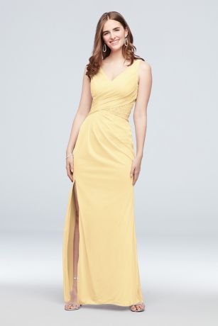 A lace insert at the waist, a draped V-neck bodice, and a skirt slit are figure-flattering details that differentiate this long sheath dress.