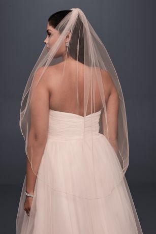 Echo the warm tones of a pink wedding dress with this coordinating, metallic-edged, elbow-length veil.