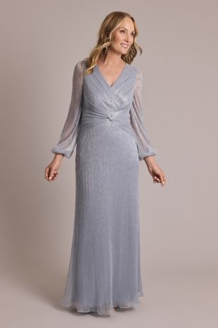 This stunning metallic long-sleeve knotted sheath dress from David's Bridal is the perfect choice for any special occasion. The shimmering fabric catches the light beautifully, making you stand out in any crowd. The knotted detail at the waist adds a touch of elegance and sophistication, while the long sleeves provide just the right amount of coverage. Whether you're attending a wedding, a holiday party, or a formal event, this dress is sure to turn heads. Pair it with your favorite heels and accessories for a complete look that is sure to impress.