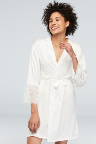 You'll just love this sleek, silky robe, perfect for getting ready on the big day! Lace trim at the elbow and metallic script at the back complete the look.