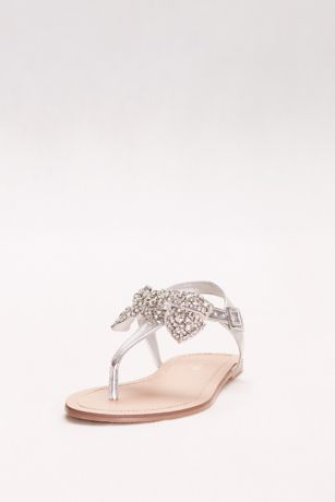 Metallic T-Strap Sandals with Embellished Bow