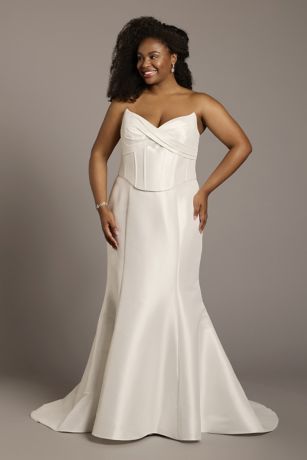 Elegant and striking, this mikado mermaid wedding dress features a sculpted strapless neckline and a flattering basque waist. The sleek silhouette flows into a dramatic flare, combining modern sophistication with timeless bridal beauty.