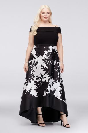 Off-the-Shoulder Ball Gown with Floral Print Skirt