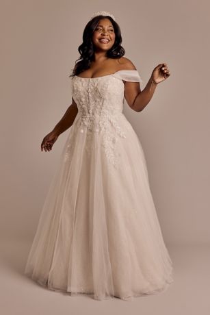 For the bride with timeless style, a stunning A-line wedding dress with off-the-shoulder swag sleeves. Intricate lace appliques at the bodice add to the effect before trailing down the voluminous tulle skirt.