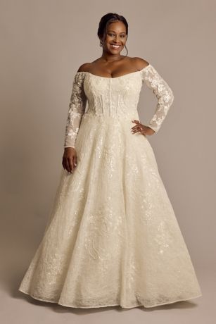 This off-the-shoulder wedding dress exudes sheer romance with gorgeous allover pearl beaded lace appliques. Off-the-shoulder long sleeves are perfect for winter weddings, indoor ceremonies, or just a little extra coverage. The ball gown skirt with chapel train makes for a stunning send-off!