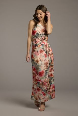 Make a statement in this luxe one-shoulder charmeuse sheath, featuring a sleek silhouette and a chic cutout detail for a modern edge.