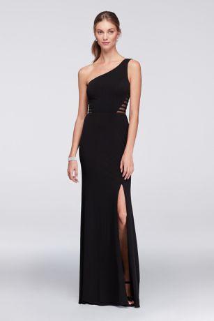 Striped mesh insets lend modern detail to a sleek, one-shoulder matte jersey dress.