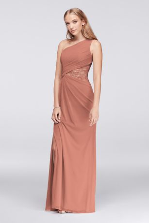 A new take on mesh and lace, a favorite bridesmaid dress pairing, this long soft gown features a sleek side cutout inset with lace.