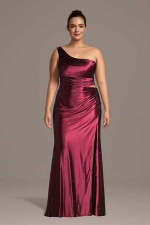This one-shoulder sculpting satin sheath dazzles with allover crystals and strategic back cutouts for a bold, modern look. It's perfect for shining at prom night or your next night out.