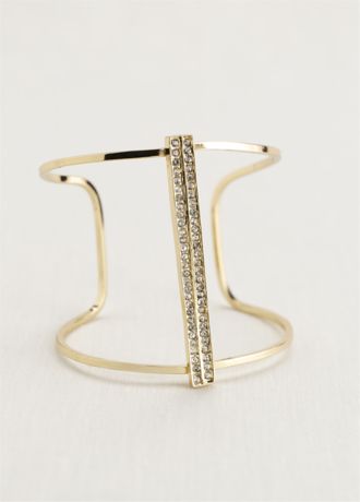 - Open cuff bracelet is connected by a vertical bar that's embellished with crystals.