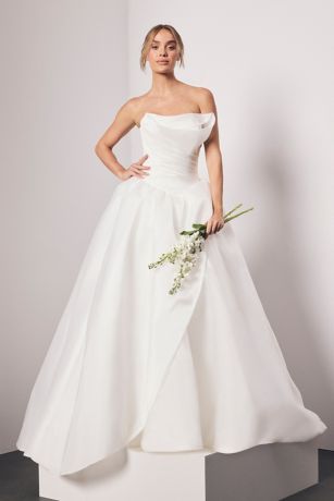 Blending airy organza with Vera Wangs signature architectural draping, this ball gown features a sculptural bodice that feels both modern and romantic. The voluminous skirt moves with effortless lightness and opens into a striking side split for added dimension and drama