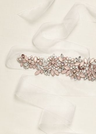 - Organza ribbon sash features stunning opaque and clear crystal embellishment in shades of pink and white.