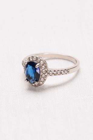 Classically pretty and regal, this deep blue crystal ring is elegantly surrounded by a halo of pave rhinestones.