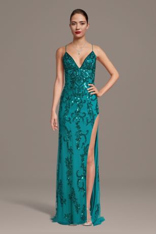 Shine all night in this paillette beaded sheath dress, featuring delicate spaghetti straps and a flattering V-neckline. The curve-skimming silhouette sparkles with every move, making it a perfect pick for prom night.