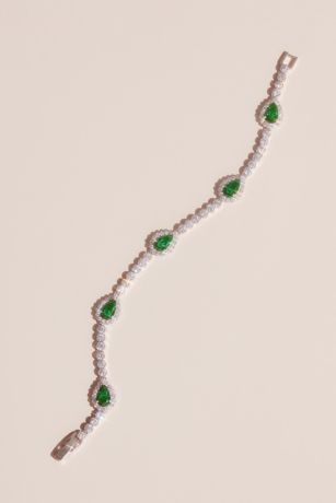Deep emerald stones are set against a glimmering crystal band to create this eye-catching bracelet. A pave halo around each emerald stone adds even more dazzle.