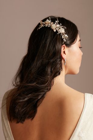 Embellished with pearl petals and crystal covered branches, this gilded comb is a statement piece for any hair style.