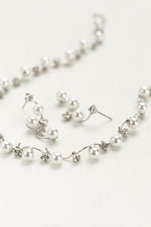 Beautiful silver wavy necklace and earring set encrusted with alternating pearl and crystal accents.