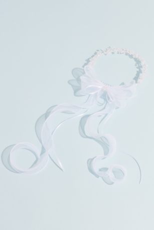 Adorned with pearls and tied with an airy organza bow, this flower girl hair wreath is sure to delight your favorite little lady.