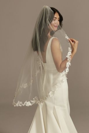 A lacy floral edge is sprinkled with light catching crystals and luminous pearls on this airy tulle fingertip veil.