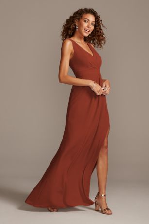 For a clean and modern wedding look, choose this stretch-crepe, V-neck bridesmaid dress. The lines of the form-fitting silhouette will fit seamlessly with the bride's sleek aesthetic while the flattering, wrap-style bodice and thigh-high slit add simple, sexy flair.