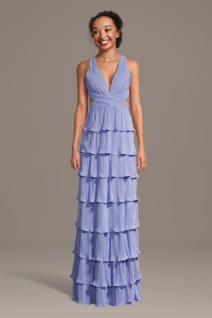This pleated tiered A-line dress features a flattering plunge neckline and flowing silhouette. Elegant and effortlessly feminine, it's perfect for prom or your next special occasion.