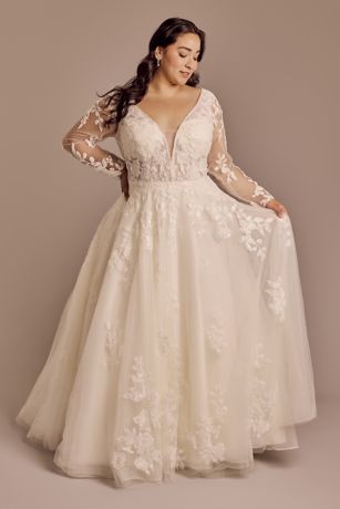 As sexy as it is graceful, this long-sleeve tulle wedding dress pairs a plunging neckline and V-shaped side panels with a ball gown silhouette and lace appliques. Interior boning ensures the intricate beading won't weigh you down.