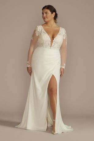 Thoughtfully designed with recycled lace fabric, this timeless-with-a-twist wedding dress features a beaded bodice, sheer mesh sleeves, and plunging V-neckline. A dramatic side slit shows off your favorite shoes.
