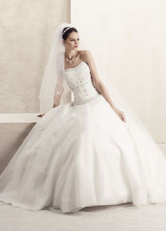 Strapless satin bodice with beaded embroidery, organza ball gown skirt, and chapel train.