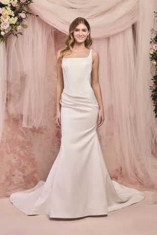 This satin mermaid wedding dress features a structured corset bodice, flattering drop waist, and elegant side draping. With a modern square neckline, it's a sophisticated choice for brides seeking a sleek, figure-hugging silhouette.