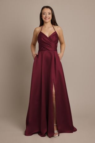 This silky satin bridesmaid dress delivers that wow-factor with a draped crisscross bodice, ball gown skirt, and pockets.